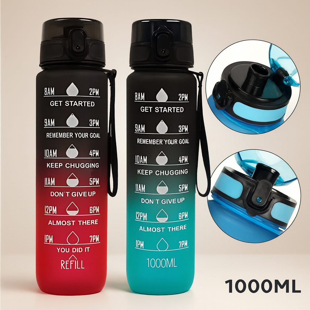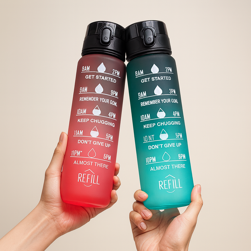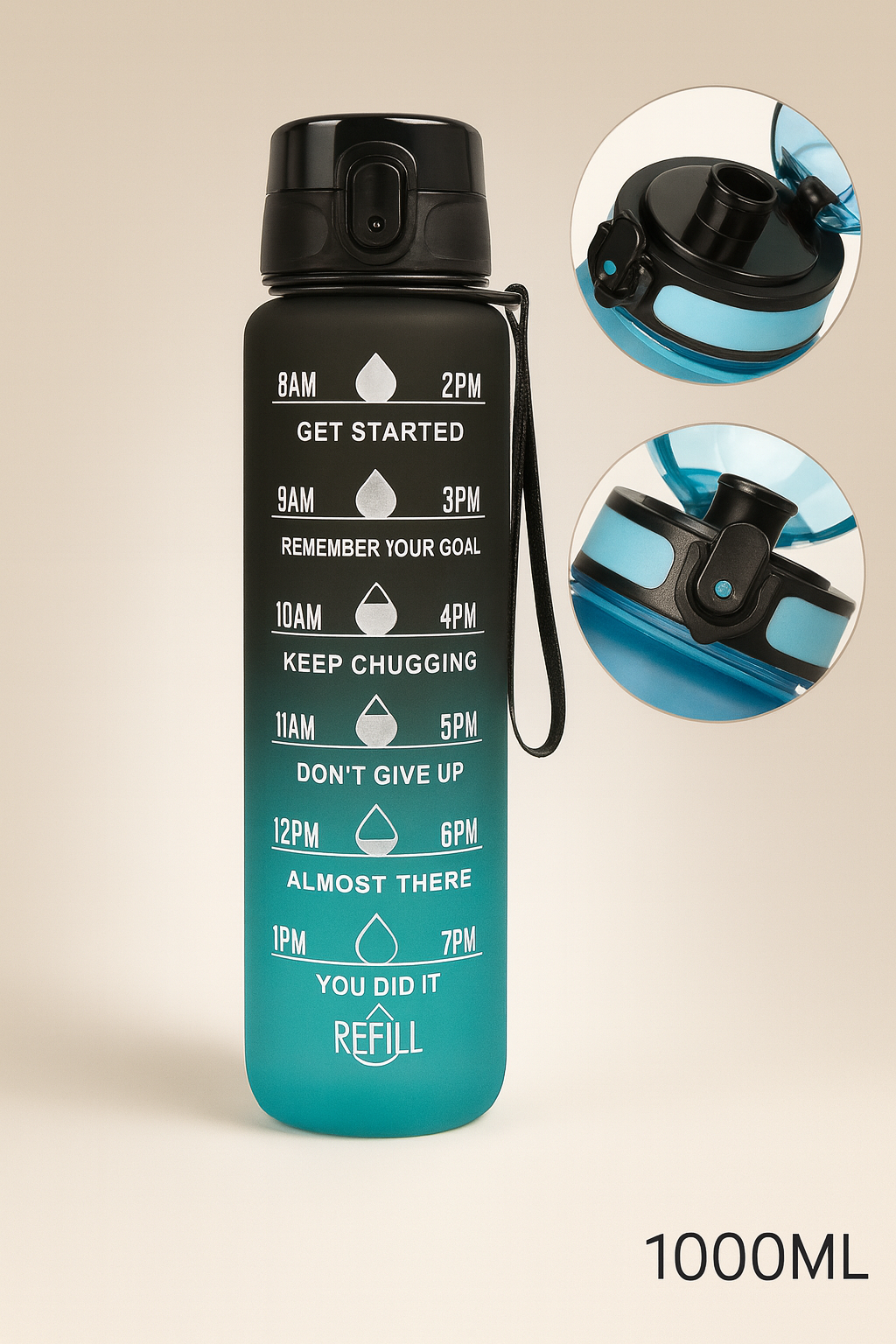 Of je nu onderweg bent, in de sportschool traint of een lange werkdag hebt, deze 1000 ml Motivatie Waterfles helpt je om moeiteloos genoeg water te drinken. Dankzij de tijdmarkeringen en motiverende teksten blijf je de hele dag door op schema – zonder te vergeten te drinken.
