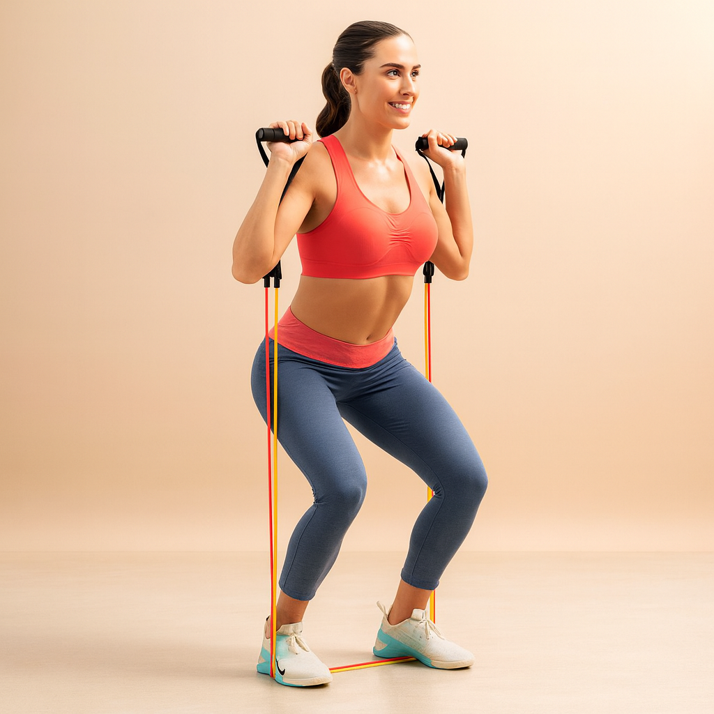 Je krijgt niet alleen de banden, maar ook alle accessoires om eindeloos te variëren: stevige handgrepen voor bovenlichaamsoefeningen, enkelbanden voor beentraining, en een deuranker waarmee je overal een ankerpunt maakt.